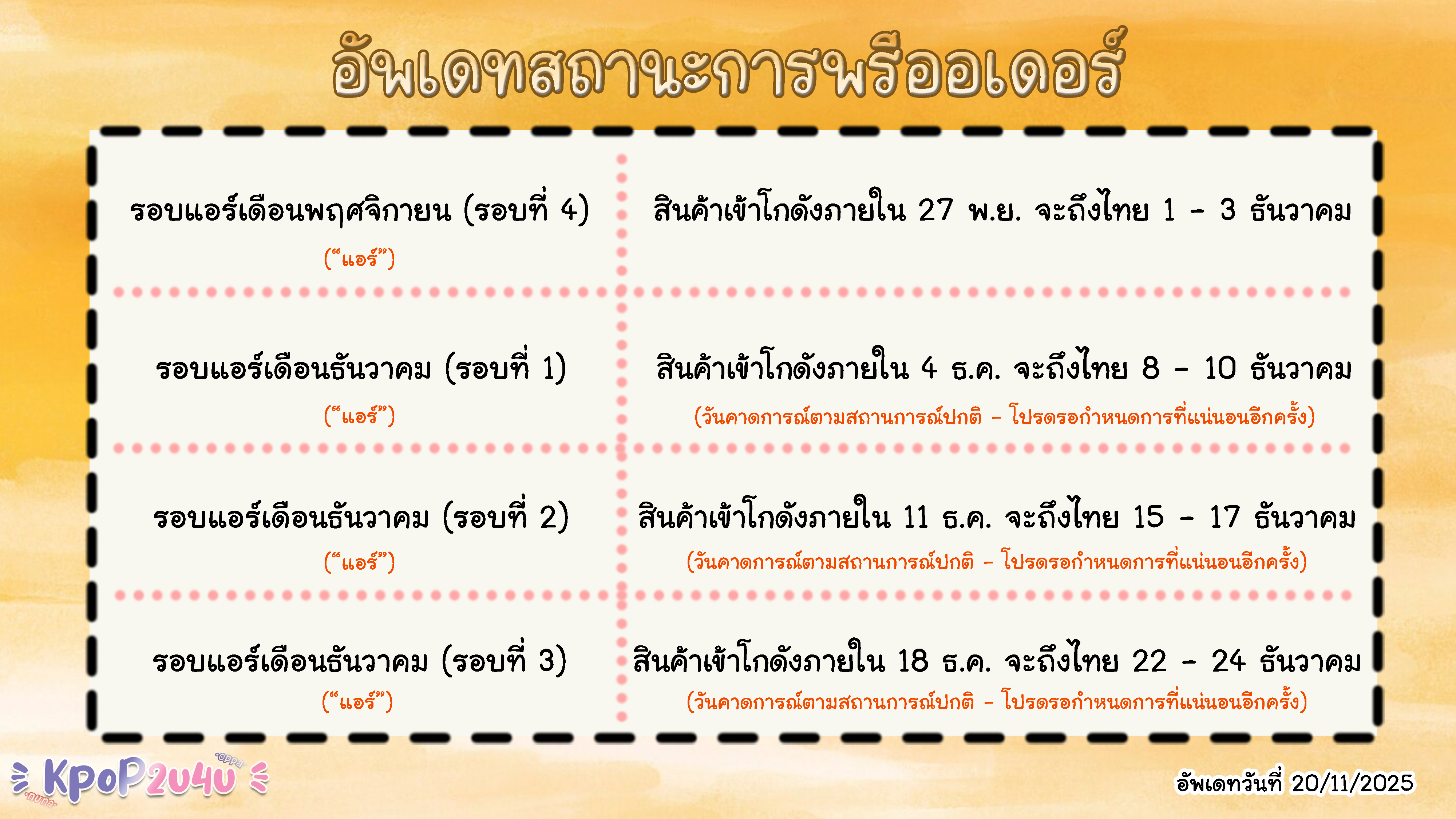** รออีเมลคอนเฟิร์มยอดเงิน ฉบับ 2 ก่อนโอนเงินทุกครั้ง ** - รอบแอร์เดือนพฤศจิกายน (รอบ 4) เปิดรับออเดอร์ - รอบแอร์เดือนพฤศจิกายน (รอบ 3) ปิดรับออเดอร์ (ไม่มีออเดอร์ส่งกลับ) - รอบแอร์เดือนพฤศจิกายน (รอบ 2) ปิดรับออเดอร์ (จัดส่งสินค้าแล้ว) - รอบแอร์เดือนพฤศจิกายน (รอบ 1) ปิดรับออเดอร์ (จัดส่งสินค้าแล้ว) - รอบแอร์เดือนตุลาคม (รอบ 4) ปิดรับออเดอร์ (จัดส่งสินค้าแล้ว) - รอบแอร์เดือนตุลาคม (รอบ 3) ปิดรับออเดอร์ (จัดส่งสินค้าแล้ว) - รอบแอร์เดือนตุลาคม (รอบ 2) ปิดรับออเดอร์ (จัดส่งสินค้าแล้ว) - รอบแอร์เดือนตุลาคม (รอบ 1) ปิดรับออเดอร์ (จัดส่งสินค้าแล้ว) - รอบแอร์เดือนกันยายน (รอบ 4) ปิดรับออเดอร์ (จัดส่งสินค้าแล้ว) - รอบแอร์เดือนกันยายน (รอบ 3) ปิดรับออเดอร์ (ไม่มีออเดอร์ส่งกลับ) - รอบแอร์เดือนกันยายน (รอบ 2) ปิดรับออเดอร์ (ไม่มีออเดอร์ส่งกลับ) - รอบแอร์เดือนกันยายน (รอบ 1) ปิดรับออเดอร์ (จัดส่งสินค้าแล้ว) - รอบแอร์เดือนสิงหาคม (รอบ 4) ปิดรับออเดอร์ (จัดส่งสินค้าแล้ว) - รอบแอร์เดือนสิงหาคม (รอบ 3) ปิดรับออเดอร์ (จัดส่งสินค้าแล้ว) - รอบแอร์เดือนสิงหาคม (รอบ 2) ปิดรับออเดอร์ (ไม่มีออเดอร์ส่งกลับ) - รอบแอร์เดือนสิงหาคม (รอบ 1) ปิดรับออเดอร์ (ไม่มีออเดอร์ส่งกลับ) - รอบแอร์เดือนกรกฎาคม (รอบ 5) ปิดรับออเดอร์ (จัดส่งสินค้าแล้ว) - รอบแอร์เดือนกรกฎาคม (รอบ 4) ปิดรับออเดอร์ (จัดส่งสินค้าแล้ว) - รอบแอร์เดือนกรกฎาคม (รอบ 3) ปิดรับออเดอร์ (ไม่มีออเดอร์ส่งกลับ) - รอบแอร์เดือนกรกฎาคม (รอบ 2) ปิดรับออเดอร์ (ไม่มีออเดอร์ส่งกลับ) - รอบแอร์เดือนกรกฎาคม (รอบ 1) ปิดรับออเดอร์ (จัดส่งสินค้าแล้ว) - รอบแอร์เดือนมิถุนายน (รอบ 4) ปิดรับออเดอร์ (จัดส่งสินค้าแล้ว) - รอบแอร์เดือนมิถุนายน (รอบ 3) (JP) ปิดรับออเดอร์ (จัดส่งสินค้าแล้ว) - รอบแอร์เดือนมิถุนายน (รอบ 3) (KR) ปิดรับออเดอร์ (ไม่มีออเดอร์ส่งกลับ) - รอบแอร์เดือนมิถุนายน (รอบ 2) ปิดรับออเดอร์ (จัดส่งสินค้าแล้ว) - รอบแอร์เดือนมิถุนายน (รอบ 1) ปิดรับออเดอร์ (จัดส่งสินค้าแล้ว) - รอบแอร์เดือนพฤษภาคม (รอบ 5) ปิดรับออเดอร์ (จัดส่งสินค้าแล้ว) - รอบแอร์เดือนพฤษภาคม (รอบ 4) ปิดรับออเดอร์ (จัดส่งสินค้าแล้ว) - รอบแอร์เดือนพฤษภาคม (รอบ 3) ปิดรับออเดอร์ (ไม่มีออเดอร์ส่งกลับ) - รอบแอร์เดือนพฤษภาคม (รอบ 2) ปิดรับออเดอร์ (ไม่มีออเดอร์ส่งกลับ) - รอบแอร์เดือนพฤษภาคม (รอบ 1) ปิดรับออเดอร์ (จัดส่งสินค้าแล้ว) - รอบแอร์เดือนเมษายน (รอบ 4) ปิดรับออเดอร์ (จัดส่งสินค้าแล้ว) - รอบแอร์เดือนเมษายน (รอบ 3) ปิดรับออเดอร์ (จัดส่งสินค้าแล้ว) - รอบแอร์เดือนเมษายน (รอบ 2) ปิดรับออเดอร์ (จัดส่งสินค้าแล้ว) - รอบแอร์เดือนเมษายน (รอบ 1) ปิดรับออเดอร์ (จัดส่งสินค้าแล้ว) - รอ