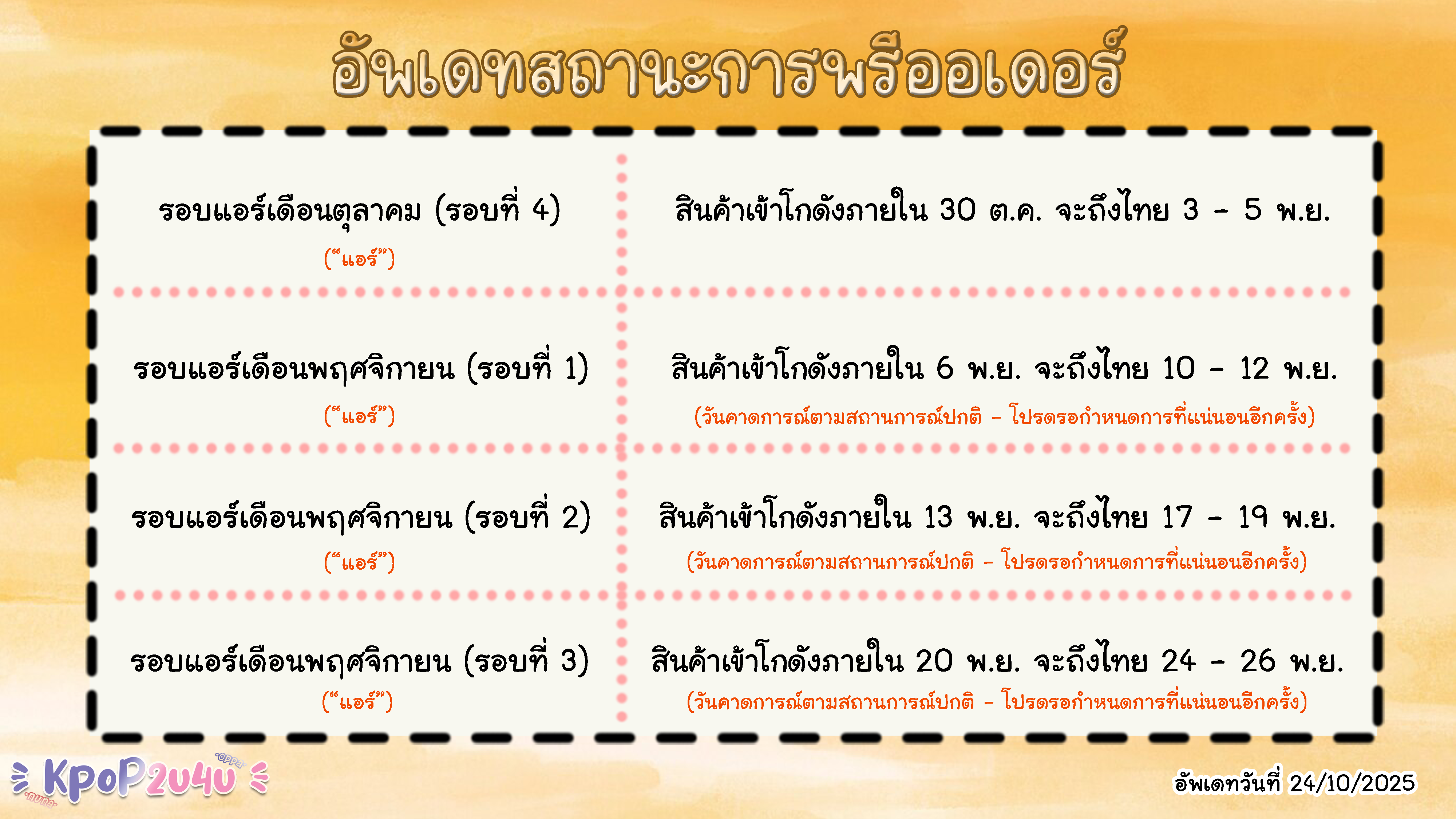 ** รออีเมลคอนเฟิร์มยอดเงิน ฉบับ 2 ก่อนโอนเงินทุกครั้ง ** - รอบแอร์เดือนพฤศจิกายน (รอบ 1) เปิดรับออเดอร์ - รอบแอร์เดือนตุลาคม (รอบ 4) ปิดรับออเดอร์ (รอตัดรอบแอร์ 30/10) - รอบแอร์เดือนตุลาคม (รอบ 3) ปิดรับออเดอร์ (จัดส่งสินค้าแล้ว) - รอบแอร์เดือนตุลาคม (รอบ 2) ปิดรับออเดอร์ (จัดส่งสินค้าแล้ว) - รอบแอร์เดือนตุลาคม (รอบ 1) ปิดรับออเดอร์ (จัดส่งสินค้าแล้ว) - รอบแอร์เดือนกันยายน (รอบ 4) ปิดรับออเดอร์ (จัดส่งสินค้าแล้ว) - รอบแอร์เดือนกันยายน (รอบ 3) ปิดรับออเดอร์ (ไม่มีออเดอร์ส่งกลับ) - รอบแอร์เดือนกันยายน (รอบ 2) ปิดรับออเดอร์ (ไม่มีออเดอร์ส่งกลับ) - รอบแอร์เดือนกันยายน (รอบ 1) ปิดรับออเดอร์ (จัดส่งสินค้าแล้ว) - รอบแอร์เดือนสิงหาคม (รอบ 4) ปิดรับออเดอร์ (จัดส่งสินค้าแล้ว) - รอบแอร์เดือนสิงหาคม (รอบ 3) ปิดรับออเดอร์ (จัดส่งสินค้าแล้ว) - รอบแอร์เดือนสิงหาคม (รอบ 2) ปิดรับออเดอร์ (ไม่มีออเดอร์ส่งกลับ) - รอบแอร์เดือนสิงหาคม (รอบ 1) ปิดรับออเดอร์ (ไม่มีออเดอร์ส่งกลับ) - รอบแอร์เดือนกรกฎาคม (รอบ 5) ปิดรับออเดอร์ (จัดส่งสินค้าแล้ว) - รอบแอร์เดือนกรกฎาคม (รอบ 4) ปิดรับออเดอร์ (จัดส่งสินค้าแล้ว) - รอบแอร์เดือนกรกฎาคม (รอบ 3) ปิดรับออเดอร์ (ไม่มีออเดอร์ส่งกลับ) - รอบแอร์เดือนกรกฎาคม (รอบ 2) ปิดรับออเดอร์ (ไม่มีออเดอร์ส่งกลับ) - รอบแอร์เดือนกรกฎาคม (รอบ 1) ปิดรับออเดอร์ (จัดส่งสินค้าแล้ว) - รอบแอร์เดือนมิถุนายน (รอบ 4) ปิดรับออเดอร์ (จัดส่งสินค้าแล้ว) - รอบแอร์เดือนมิถุนายน (รอบ 3) (JP) ปิดรับออเดอร์ (จัดส่งสินค้าแล้ว) - รอบแอร์เดือนมิถุนายน (รอบ 3) (KR) ปิดรับออเดอร์ (ไม่มีออเดอร์ส่งกลับ) - รอบแอร์เดือนมิถุนายน (รอบ 2) ปิดรับออเดอร์ (จัดส่งสินค้าแล้ว) - รอบแอร์เดือนมิถุนายน (รอบ 1) ปิดรับออเดอร์ (จัดส่งสินค้าแล้ว) - รอบแอร์เดือนพฤษภาคม (รอบ 5) ปิดรับออเดอร์ (จัดส่งสินค้าแล้ว) - รอบแอร์เดือนพฤษภาคม (รอบ 4) ปิดรับออเดอร์ (จัดส่งสินค้าแล้ว) - รอบแอร์เดือนพฤษภาคม (รอบ 3) ปิดรับออเดอร์ (ไม่มีออเดอร์ส่งกลับ) - รอบแอร์เดือนพฤษภาคม (รอบ 2) ปิดรับออเดอร์ (ไม่มีออเดอร์ส่งกลับ) - รอบแอร์เดือนพฤษภาคม (รอบ 1) ปิดรับออเดอร์ (จัดส่งสินค้าแล้ว) - รอบแอร์เดือนเมษายน (รอบ 4) ปิดรับออเดอร์ (จัดส่งสินค้าแล้ว) - รอบแอร์เดือนเมษายน (รอบ 3) ปิดรับออเดอร์ (จัดส่งสินค้าแล้ว) - รอบแอร์เดือนเมษายน (รอบ 2) ปิดรับออเดอร์ (จัดส่งสินค้าแล้ว) - รอบแอร์เดือนเมษายน (รอบ 1) ปิดรับออเดอร์ (จัดส่งสินค้าแล้ว) - รอบแอร์เดือนมีนาคม (รอบ 4) ปิดรับออเดอร์ (จัดส่งสินค้าแล้ว) - รอบแอร์เดือนมีนาคม (รอบ 3) ปิดรับออเดอร์ (จัดส่งสินค้าแล้ว) - รอบแอร์เดือนมีนาคม (รอบ 2) ปิดรับออเดอร์ (จัดส่งสินค้าแล้ว) - รอบแอร์เดือนมีนา